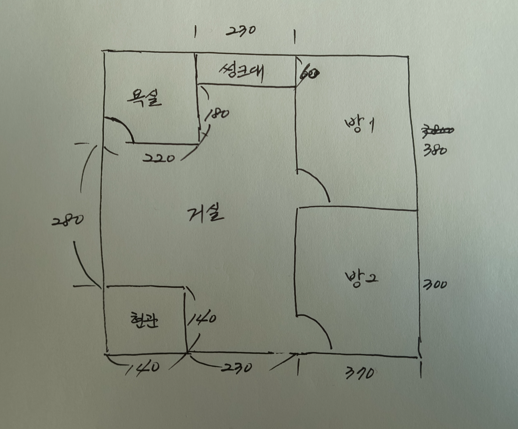 시공할 공간 크기를 줄자로 측정합니다. 센티미터 단위이며 충분합니다. 1센티미터 이하는 올림처리합니다. 429.2센티미터인 경우 430센티미터로 올려줍니다. 측정 위치는 최소 2 ~ 3군데 잡아 가장 긴 길이를 선택합니다. 이 공간의 가로 430센티미터, 세로 390센티미터입니다. 장판 표면 패턴에 따라 시공 방향을 결정합니다. 방문 또는 출입문에서 세우거나 눕힙니다. 세우는 것은 세로 시공, 눕히는 것은 가로시공입니다. 시공 방향은 통일감 있게 맞춰야 공간이 보다 커 보이는 거나 길어 보입니다. 이 예시에서는 출입문에서 세우겠습니다. 세로 시공입니다. 재단 길이는 측정한 세로 길이에 10 ~ 20센티미터를 더합니다. 400 ~ 410센티미터가 됩니다. 벽면에 걸레받이[바닥몰딩]가 있다면 10센티미터를, 없다면 20센티미터를 더합니다. 정밀하게 재단이 가능하다면 15센티미터 여유도 괜찮습니다. 걸레받이가 마감된 곳에서 장판을 걸레받이 끝선에 맞게 막 칼질하여 실리콘으로 마감합니다. 그렇지 않은 곳에서는 약 5센티미터 꺾어 올려 칼질을 하며 걸레받이로 대용합니다.