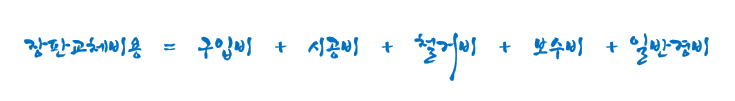 구입비는 장판 구입 비용을, 시공비는 장판 시공 비용을 말합니다. 철거비는 기존 장판을 철거할 경우 폐기물 처리비용입니다. 덧빵시공을 할 경우 해당되지 않습니다. 보수비는 기존 장판 철거 후 바닥상태가 양호하지 않는 경우 바닥을 고치거나 손질해야 하는 비용입니다. 장판을 걷어내기 전까지 바닥상태를 알 수 없습니다. 시공할 때 추가되는 비용입니다. 깨지거나 금이 간 경우에 해당됩니다. 일반경비는 교통비, 식비, 쓰레기처리비용 등을 말합니다.