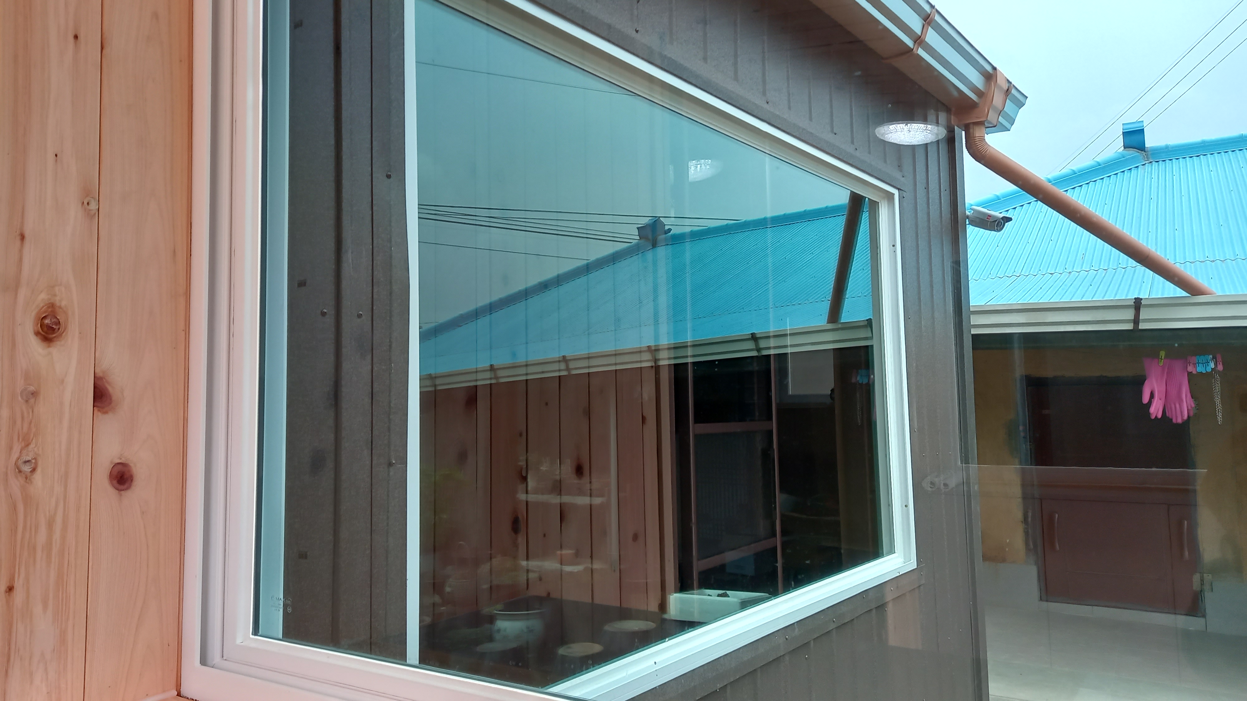 거실 유리의 창틀 기준으로 그 크기는 2120 x 1225, 2115 x 1265 [mm x mm] 이다. 자동차에 사용되는 크기보다 훨씬 크다. 자동차처럼 곡면이 없는 평면이라 곡면을 잡을 필요는 없다. 자동차처럼 정재단을 하지 않는다. 실링처리한 부분까지 포함한 창틀까지 정재단을 한다. 접착 후 칼받이로 잘라낸다. 그러면 깔끔해게 마무리가 된다.