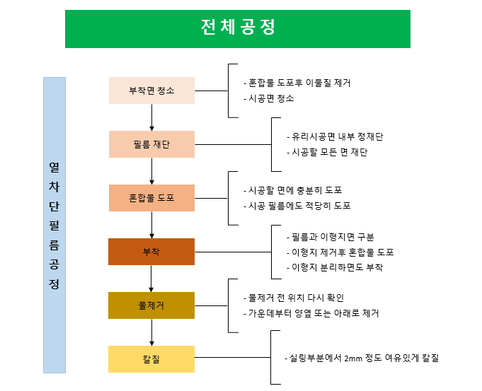 열차단 필름 시공 전체 과정중 제일 중요하고 힘든 작업이 몇 가지 있다. 첫 번째가 필름과 이형지를 구분하는 것이다. 이형지는 투명하고, 필름은 투과율을 있는 제품이라 약간은 색상을 띠고 있다. 두 번째는 이형지를 분리하는 과정입니다. 투명테이프와 혼합물을 이용한다. 접착력이 있는 필름 부분은 한 번 달라붙으면 떨어지지가 힘들기 때문이다. 그 안에 있는 공기를 모두 빼내지 못하면 필름 붙인 반대쪽에서 빠지지 않은 공기가 그대로 보이게 됩니다. 아주 난감한 상황이 발생한다. 이런 일은 발생하지 않게 해야 한다.
