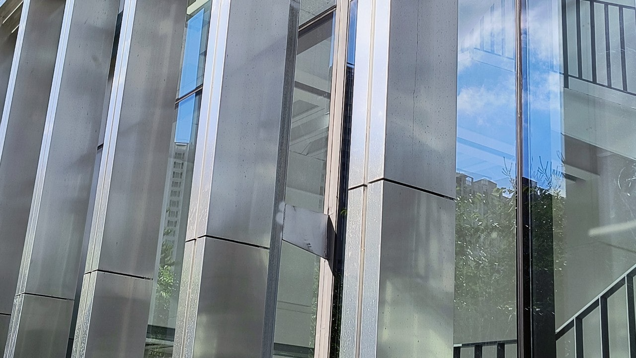 건물 구조와 별도로 금속 패널이 부착되는 방식. 알루미늄 프레임에 금속판을 체결합니다. - 스파이더 시스템 (점지지 방식)