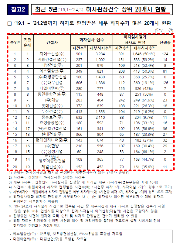 국토교통부, 하자 판정 건수 상위 20개사 명단 공개