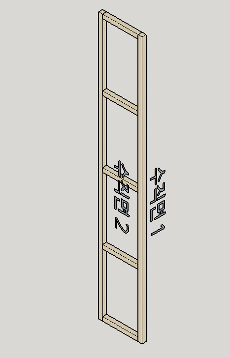 세로 목틀과 가로목틀을 만든 후에는 아래 사진처럼 세워 부착을 해야 한다. 레이저 레벨기를 이용하여 수직면을 잡아야 한다. 잡아야 할 수직면은 두 곳이다. 수직면 1, 2를 동시에 맞추기는 쉽지 않다. 수직면을 맞추기 쉬운 것부터 가고정을 한다. 두 번째 수직면을 맞춘 후 가고정을 한다. 수직을 재차 확인 후 단단히 고정 작업을 들어간다.