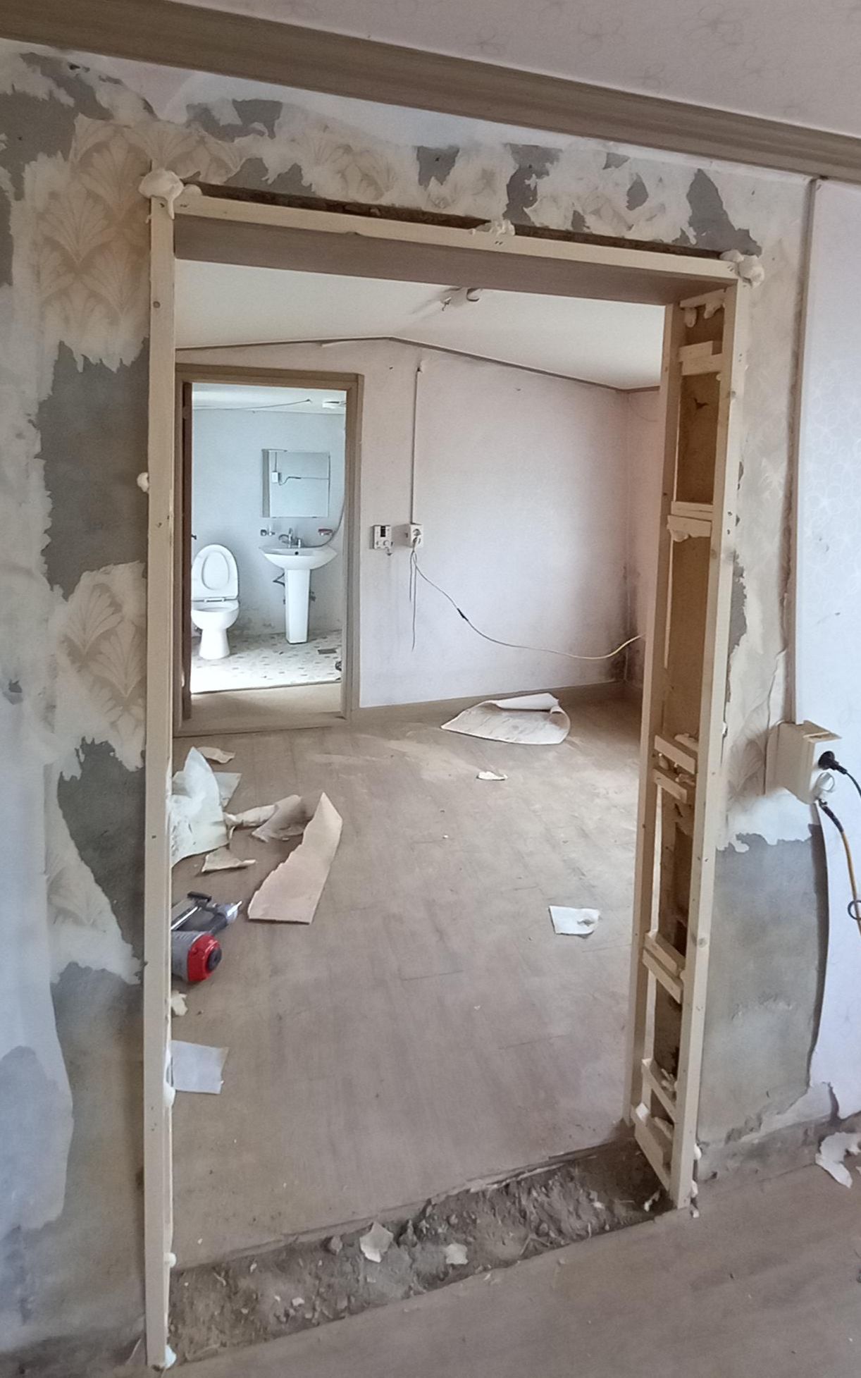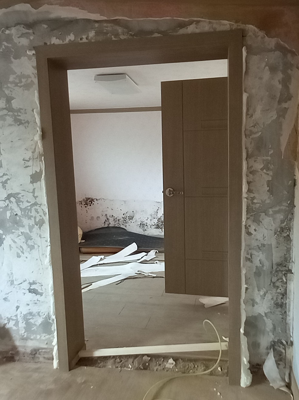 출입문틀 작업이 마무리가 된 후 출입문 양쪽에 철거했던 걸레받이를 시공해야 한다. 재활용이 가능한 것과 신규 제품을 섞어 표가 잘 안 나게 시공마무리했다.