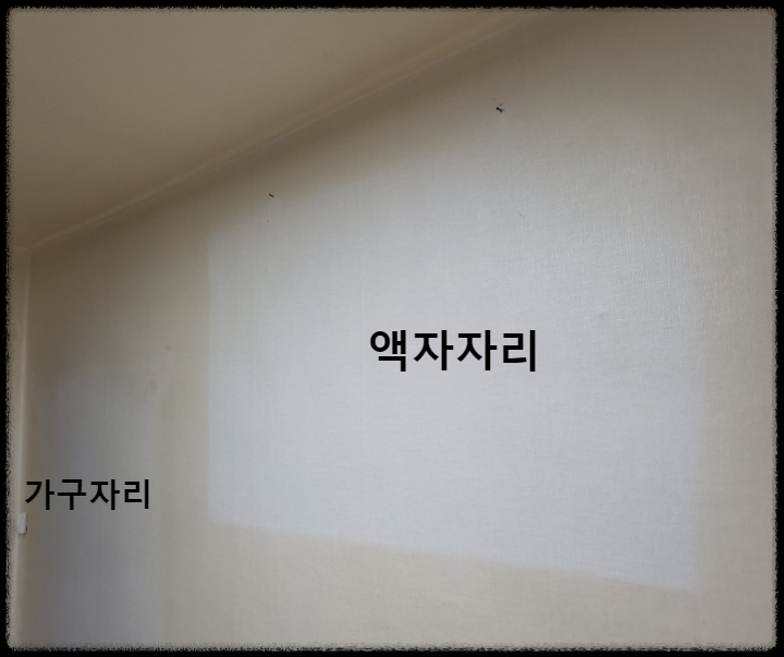 벽지는 도배를 하는 순간부터 변색이 됩니다. 벽지는 제조사에서 생산후 수량에 맞게 종이박스에 넣어 보관합니다. 무게를 고려해서 실크벽지의 한 박스는 4 롤이고, 광폭합지벽지는 6 롤입니다. 무게는 약 20Kg 내외입니다. 직 간접적인 햇빛에 노출이 되지 않는 상태에서 보관이 됩니다. 박스를 열고 나오는 순간, 간접적인 햇빛에 노출이 되어 변색이 시작됩니다. 도배한 지 몇 년 후에 액자가 걸린 벽지 부분과 그렇지 않은 벽지 부분의 변색 정도 차이가 생깁니다. 아래 사진이 그런 현상을 잘 보여주고 있습니다.