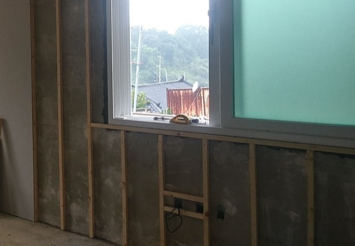 | 수직/수평 기준 상실 | 기존 창틀 자체가 수평이 맞지 않아 새로 세운 벽체도 휘어 보임. | 창틀을 무시하고 벽체는 레이저 기준으로 수직을 잡는 원칙. |