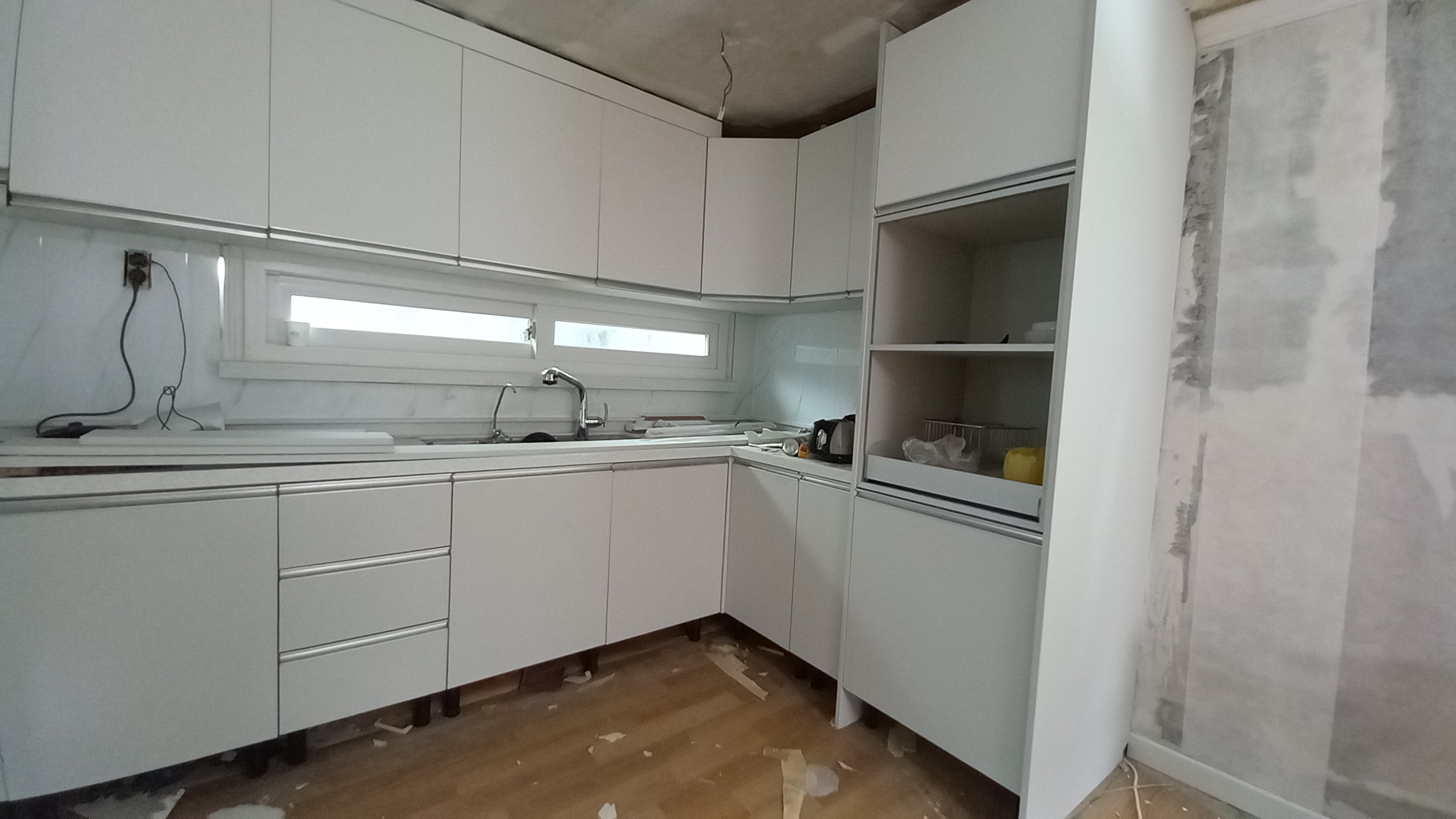 • 상부장 몰딩을 탈착 후 꺾인 면을 전처리를 했다. 건조되는 동안 필름 자재 중 하부장에 사용할 필름을 재단 후 가장 긴 상부장 몰딩부터 시작을 했다. 이어 탈착된 상부장 문짝 시공에 들어갔다. 시공이 완료된 상부장 문짝을 부착했다. 미비한 점을 보안했다. 이어 키 큰 장 양 옆부분과 탈착 한 하부장 문짝 기초 작업 후 상부장과 같은 방법과 순서로 시공을 했다.