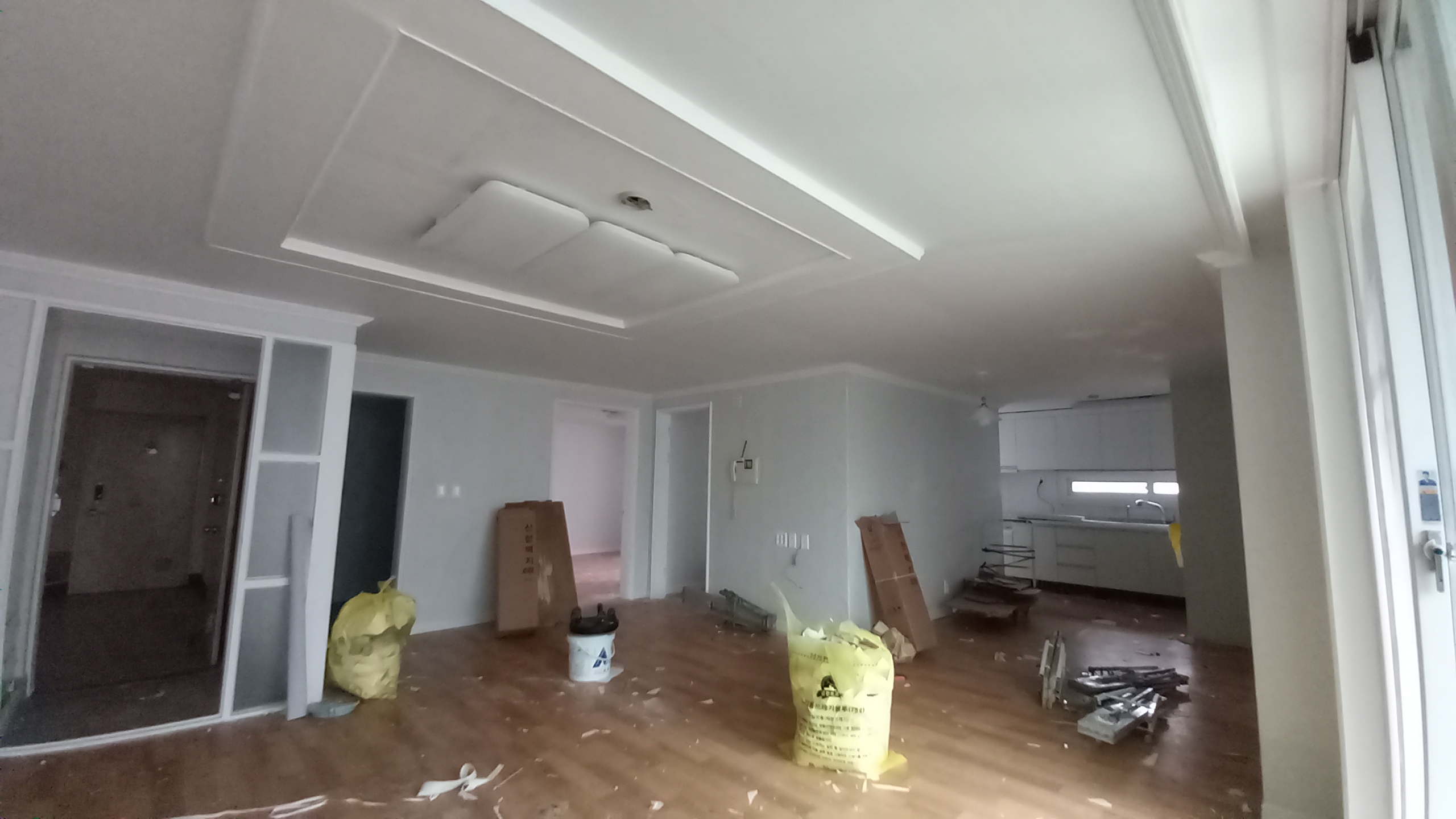 - 어제 했던 도배 기초 작업에 도배 정배, 천정만 했다. 이 집에서 벽 높이는 약 2.3m이다. 천정은 혼자 가능한 경우도 있지만 보통 2명 이상 팀 작업을 한다. 물론 천정 정배가 끝나는 데로 전등, 감지기, 기타 부착물들을 부착을 했다.