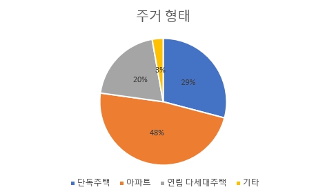 2022년 9월 6일 갱신한 통계청 자료 2020년의 가구의 주택 유형을 살펴보면 단독주택 29.1%, 아파트 48.1%, 연립 다세대주택 20.0%, 기타 2.8%로 발표했습니다. 아파트 주거 비중이 과반수입니다. 2명 중 한 명은 아파트에 거주한다는 의미입니다.