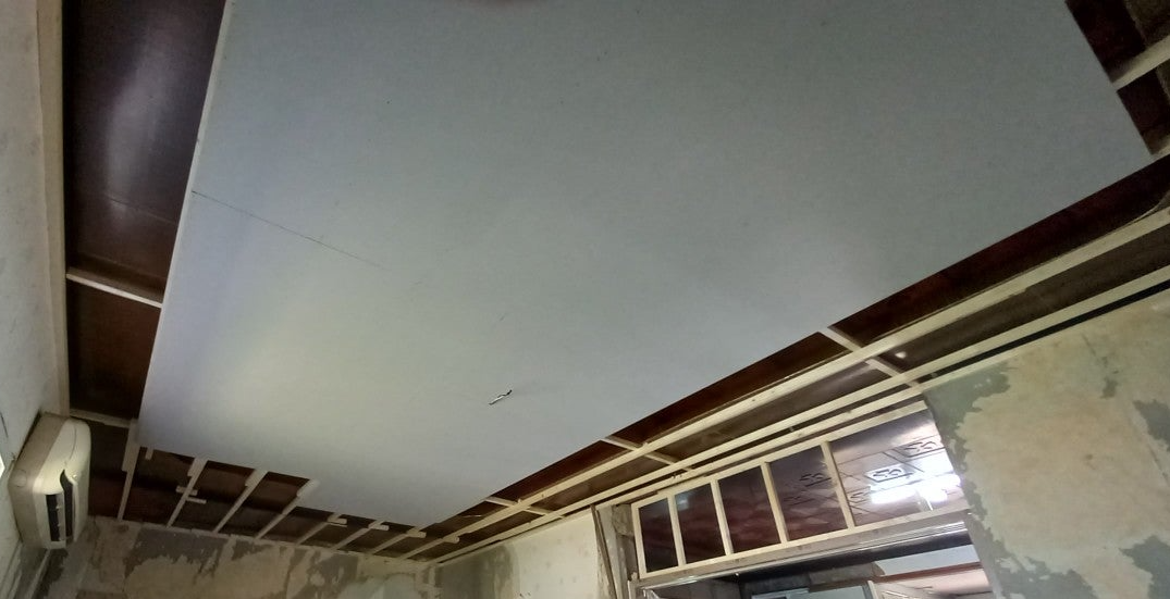 사진설명 : 이 공간은 처음 상담 때 천장 공사를 하지 않기로 결정했던 곳이다. 외관상 큰 이상이 없어 보였고, 벽 도배만으로도 정리가 가능해 보였다. 하지만 기존 마감재를 유지한 채 작업에 들어가기 전, 레이저 레벨기로 수평을 다시 확인했다. 측정 결과, 천장 중앙부 처짐이 약 10cm 이상. 이 상태에서 천장을 건드리지 않고 벽만 도배할 경우, 벽지는 천장 라인을 따라 심하게 쏠리게 된다. 결과적으로 마감은 깔끔해 보이지 않고, 안 한 것보다 못한 인테리어가 될 가능성이 높았다.