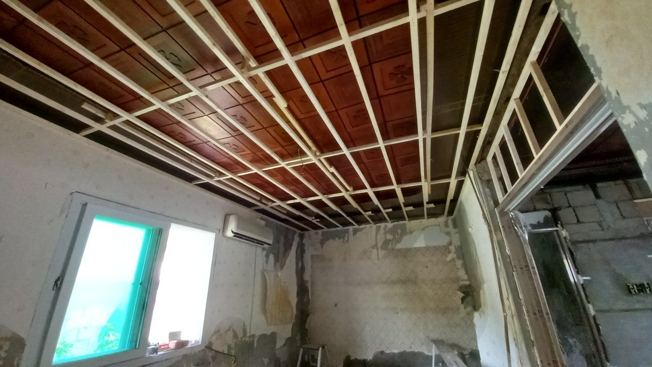 사진 설명 : 천장 처짐이 확인된 후, 기존 마감 위에 덮는 방식은 바로 배제했다. 문제를 가린 채 진행하면 결과는 반드시 더 나빠지기 때문이다. 그래서 이 공간은 기초부터 다시 만드는 선택을 했다. 사진은 기존 천장 위에 새로 기준목을 잡는 과정이다. 레이저 레벨로 수평을 다시 잡고, 처짐 정도에 맞춰 간격과 높이를 조정했다. 이 작업이 끝나야만 이후 도배나 마감 공정이 ‘보이는 대로’가 아니라 ‘기준대로’ 들어갈 수 있다. 이 과정은 시간도 많이 들고, 작업자 입장에서는 수익이 남지 않는 구간이다. 하지만 이 기초를 건너뛰면, 벽 도배와 천장 마감은 아무리 잘해도 삐뚤어 보일 수밖에 없다.그래서 이 현장은 마감보다 먼저, 기준을 다시 세우는 작업을 선택했다.