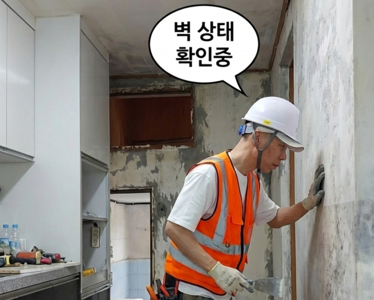 현장 재점검 중 벽 상태 사진
