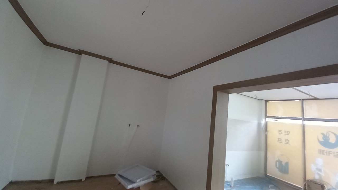 메인 홀의 주방자리 반자가 없어 천장이 보입니다. 옆에 설치된 반자 높이와 동일하게 설치합니다. 반자틀을 만들어 합판으로 반자널로 사용합니다. 평몰딩 시공을 합니다. 최종마감은 도배입니다.